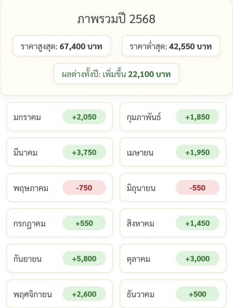 - เดือนกันยายนเป็นเดือนที่ราคาทองปรับขึ้นสูงสุดถึง 5,800 บาท ในขณะที่เดือนพฤษภาคมและมิถุนายนมีการปรับตัวลดลง