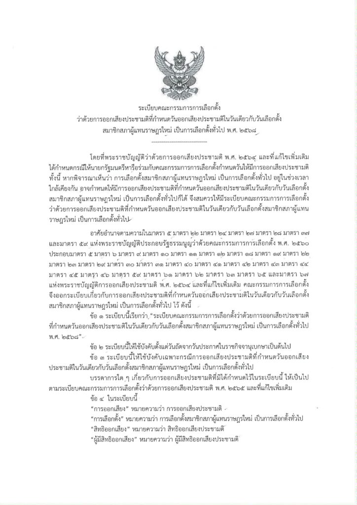 ทั้งนี้ หากพิจารณาเห็นว่า การเลือกตั้ง ส.ส.เป็นการเลือกตั้งทั่วไป อยู่ในช่วงเวลาใกล้เคียงกัน อาจกำหนดให้มีการออกเสียงประชามติที่กำหนดวันออกเสียงประชามติในวันเดียวกับวันเลือกตั้ง ส.ส.เป็นการเลือกตั้งทั่วไปก็ได้ จึงสมควรให้มีระเบียบ กกต.ว่าด้วยการออกเสียงประชามติที่กำหนดวันออกเสียงประชามติในวันเดียวกับวันเลือกตั้ง ส.ส.เป็นการเลือกตั้งทั่วไป ทั้งนี้ ระเบียบดังกล่าวอยู่ระหว่างประกาศในราชกิจจานุเบกษา