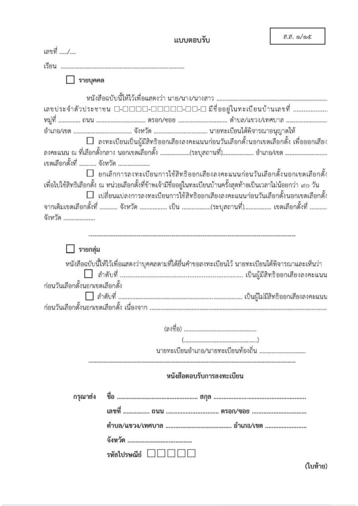 เมื่อยืนยันการลงทะเบียนเสร็จสมบูรณ์ ระบบจะแสดงแบบตอบรับ เป็นหลักฐานประกอบการลงทะเบียน เพื่อเก็บไว้เป็นหลักฐานประกอบการใช้สิทธิออกเสียงลงคะแนนนอกเขตเลือกตั้ง