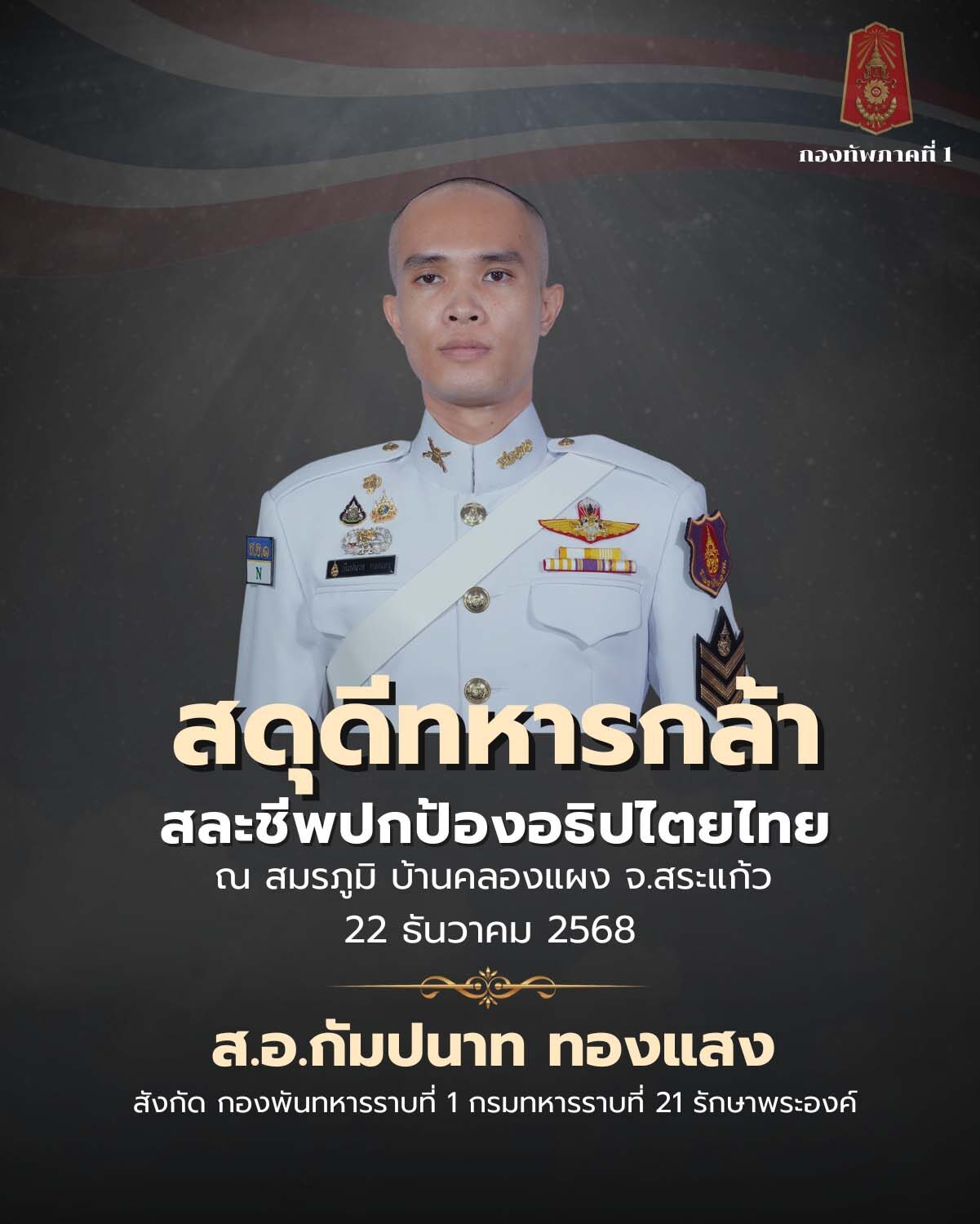 ล่าสุด กองทัพภาคที่ 1 ขอแสดงความเสียใจอย่างสุดซึ้งต่อครอบครัว “ส.อ.กัมปนาท ทองแสง” สังกัด กองพันทหารราบที่ 1 กรมทหารราบที่ 21 รักษาพระองค์(ร.21รอ.) เสียชีวิตจากการปฏิบัติหน้าที่ปกป้องอธิปไตยของชาติ ในพื้นที่ชายแดนไทย-กัมพูชา บ้านคลองแผง อ.ตาพระยา จ.สระแก้ว เมื่อ 22 ธ.ค.68