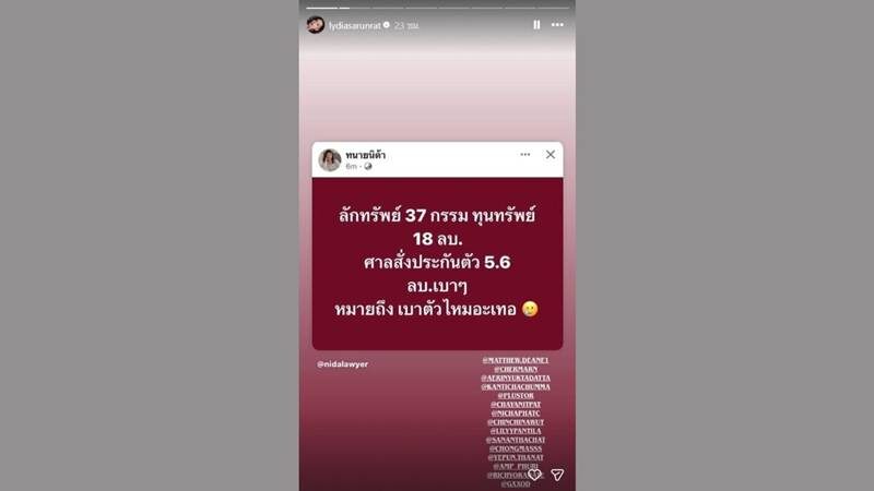 ต่อมา สาวลีเดีย ได้ออกมาแชร์ข้อความของทนายนิด้าผ่านไอจีสตอรี่ ซึ่งระบุว่า “ลักทรัพย์ 37 กรรม ทุนทรัพย์ 18 ลบ. ศาลสั่งประกันตัว 5.6 ลบ.เบาๆ หมายถึง เบาตัวไหมอะเทอ” พร้อมกับแท็กเพื่อนดาราที่เคยมีผู้จัดการคนเดียวกัน ล่าสุดวันก่อน ข่าวสดบันเทิง ได้เจอ ลีเดีย ในงาน The Social Warrior สมรภูมิโซเชียล (ซีซั่น 2) รอบ FINAL ROUND ที่ ลานหน้า POP MART BLOCK I สยามสแควร์ เลยสอบถามถึงความคืบหน้าของคดีดังกล่าว