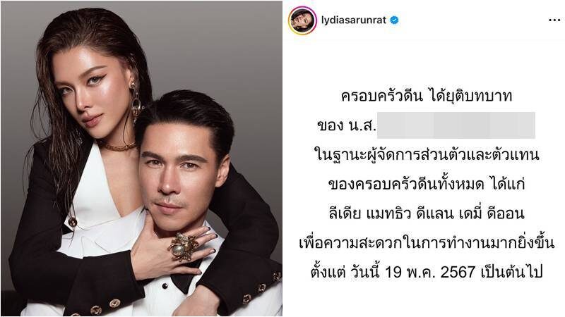 จากที่ก่อนหน้านี้นักร้องสาวชื่อดัง ลีเดีย ศรัณย์รัชต์ และสามี แมทธิว ดีน เคยออกมาโพสต์ประกาศยุติบทบาทของอดีตผู้จัดการส่วนตัวแบบฟ้าผ่า ก่อนที่เพื่อนดาราคนอื่นๆ ที่อยู่ในการดูแลของอดีตผู้จัดการคนเดียวกันก็ได้ออกมาโพสต์ยุติบทบาทเช่นกัน จนหลายคนสงสัยว่าเกิดอะไรขึ้น แม้ว่าจะไม่ได้รับคำตอบที่แน่ชัด แต่ทางฝั่งผู้จัดการดาราคนนี้ก็ได้ออกมาเคลียร์ตัวเองผ่านสื่อ ตามที่เคยเสนอข่าวไปแล้ว