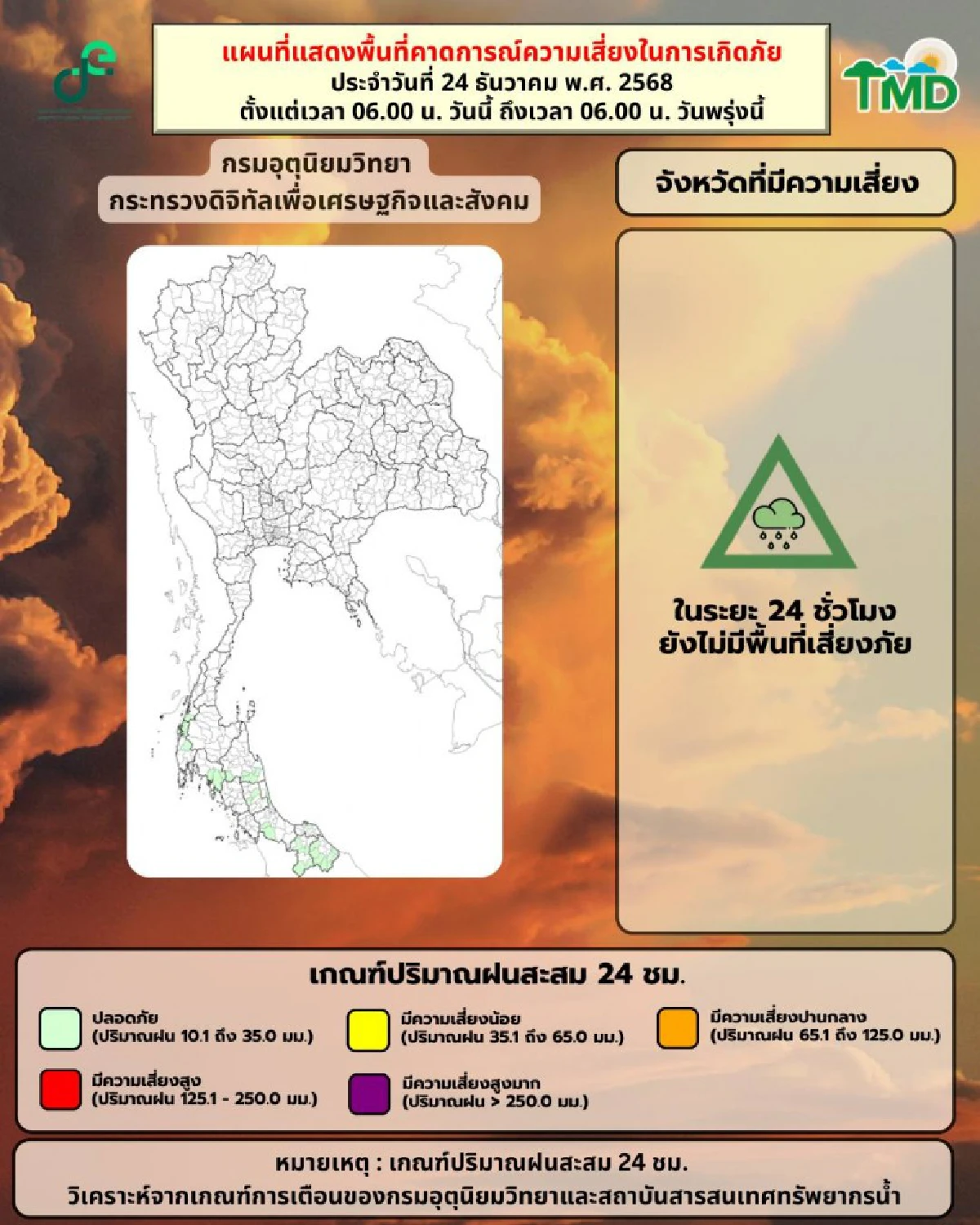 อนึ่ง ในช่วงวันที่ 25–28 ธ.ค. 68 ภาคใต้จะมีฝนเพิ่มขึ้นและมีฝนตกหนักถึงหนักมากบางแห่งทางตอนล่างของภาค เนื่องจากมรสุมตะวันออกเฉียงเหนือที่พัดปกคลุมบริเวณอ่าวไทย ภาคใต้ และทะเลอันดามันจะมีกำลังแรงขึ้น ขอให้ประชาชนบริเวณภาคใต้ตอนล่างระวังอันตรายจากฝนตกหนักถึงหนักมากและฝนที่ตกสะสม