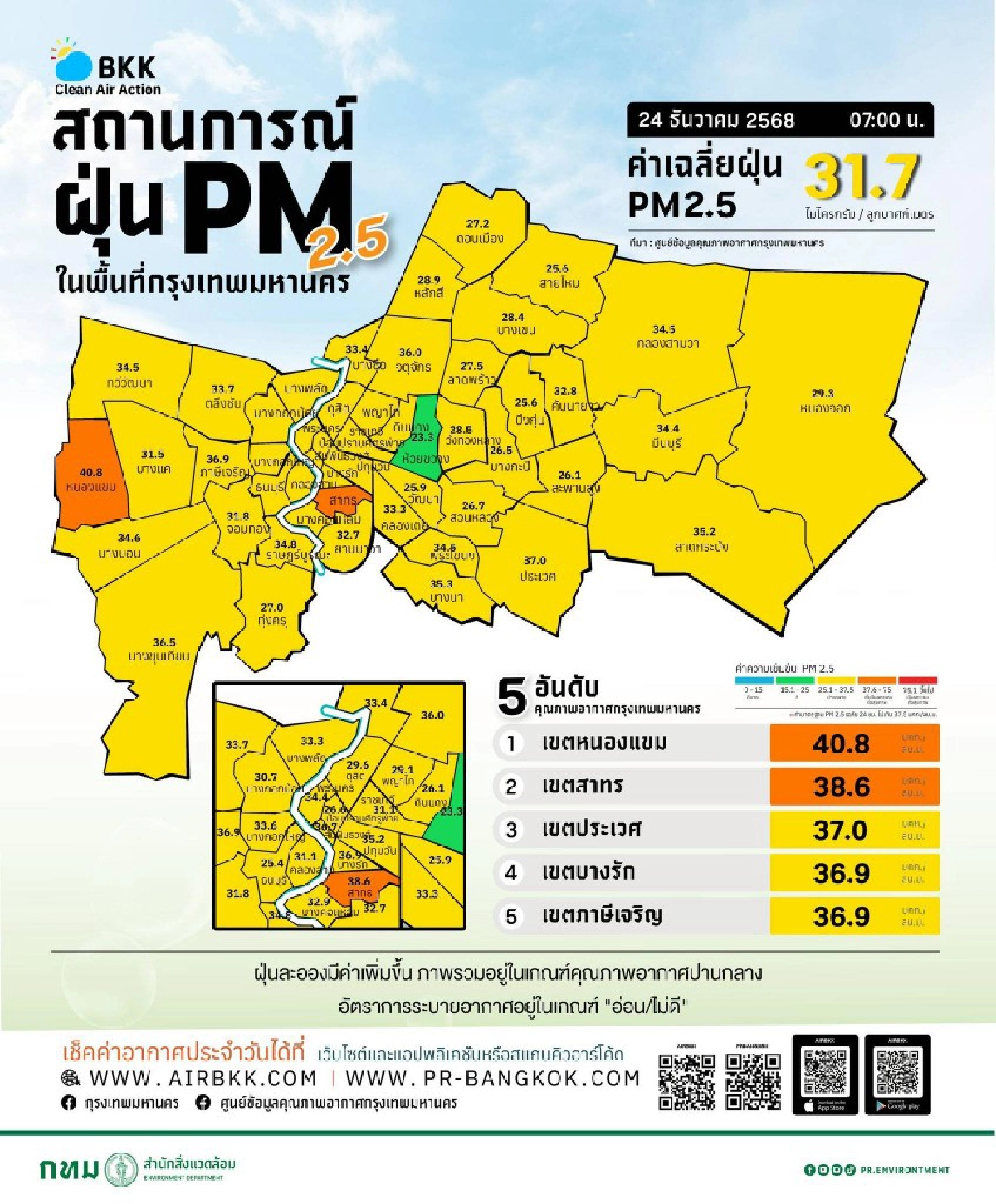 ผลชี้ กรุงเทพมหานคร "31.7" ไมโครกรัมต่อลูกบาศก์เมตร อยู่ในค่ามาตรฐานที่ 37.5 มคก./ลบ.ม. พร้อมเปิด 10 อันดับ ของค่าฝุ่น PM2.5 เขตสูงสุดในกรุงเทพมหานคร ฝุ่นละอองมีแนวโน้มลดลง คุณภาพอากาศอยู่ในเกณฑ์ปานกลาง