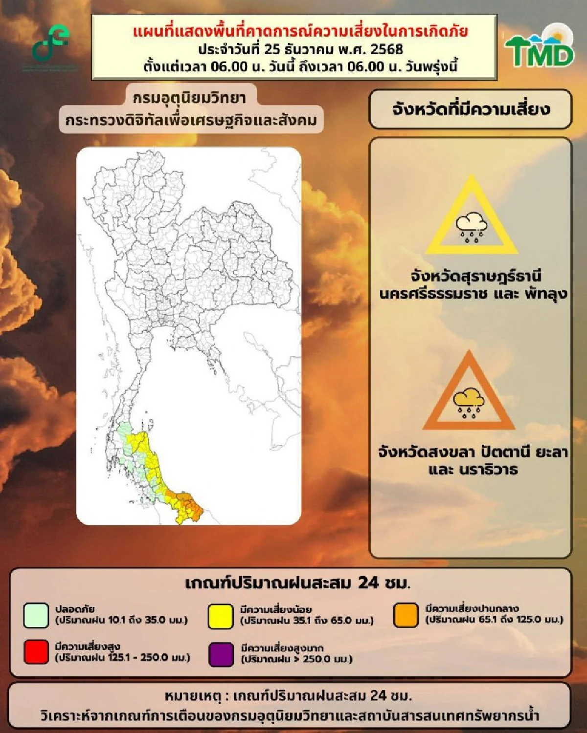 สภาพอากาศวันนี้ “อากาศแปรปรวน” กรมอุตุ พยากรณ์อากาศวันนี้ 25 ธ.ค.68 เตือนมรสุมเข้าภาคใต้ฝนตกหนัก มีฝนเพิ่มขึ้นทั่วทั้งภาค ส่วนไทยตอนบนยังคงมีอากาศหนาว ภาคอีสาน อุณหภูมิลดฮวบ 2-4°C กทม. อากาศเย็นในตอนเช้า กับมีลมแรง