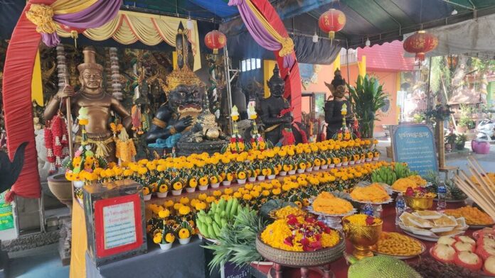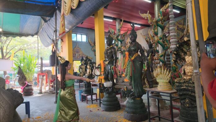 เมื่อวันที่ 25 ธ.ค.68 ที่วัดสว่างอารมณ์ ต.ขุนแก้ว อ.นครชัยศรี จ.นครปฐม ผู้สื่อข่าวรายงานว่า ที่ศาลาพระราหู 8 ทิศ สถานที่ประดิษฐานหุ่นปั้นพ่อปู่ศรีสุทโธ แม่ย่าศรีปทุมมา พญานาคราช หนึ่งในสถานที่ประดิษฐานสิ่งศักดิ์สิทธิ์ของวัด ที่มีผู้คนหลั่งไหลกันมาขอพรกันมากราบไหว้ขอพรขอโชคลาภ ในช่วงก่อนวันหวยออก