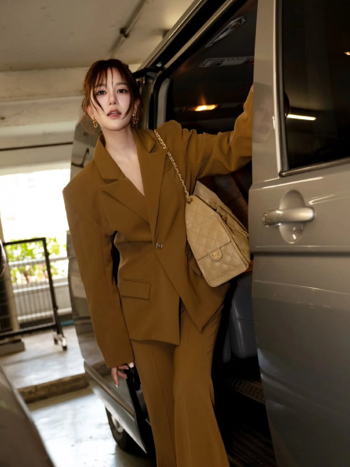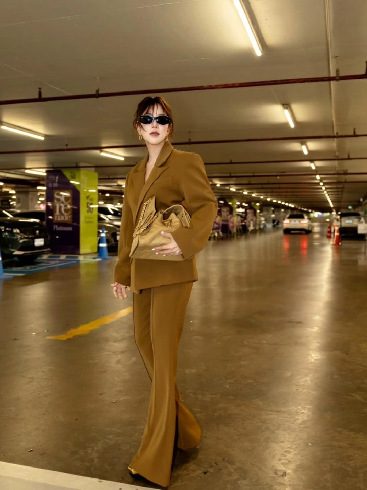 ชุดเบลเซอร์คัตติ้งเนี้ยบที่สวมคู่กับกางเกงขายาวทรงสวย ช่วยขับหุ่นให้ดูเพรียวกระชับ เสริมลุคด้วยแว่นตาดีไซน์มินิมอลและเมกอัพโทนธรรมชาติ แต่เน้นความคมเฉียบของสายตา ยิ่งทำให้ภาพรวมดูโดดเด่นและแตกต่างจากลุคที่หลายคนคุ้นเคย