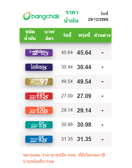 หมายเหตุ : ราคาอ้างอิงจาก บมจ.บางจากฯ ควรตรวจสอบราคา ณ สถานีเติมน้ำมันอีกครั้ง ราคาข้างต้นยังไม่รวมภาษีบำรุงท้องที่ กทม. ราคาพรุ่งนี้จะมีผลตั้งแต่เวลา 05.00 น.