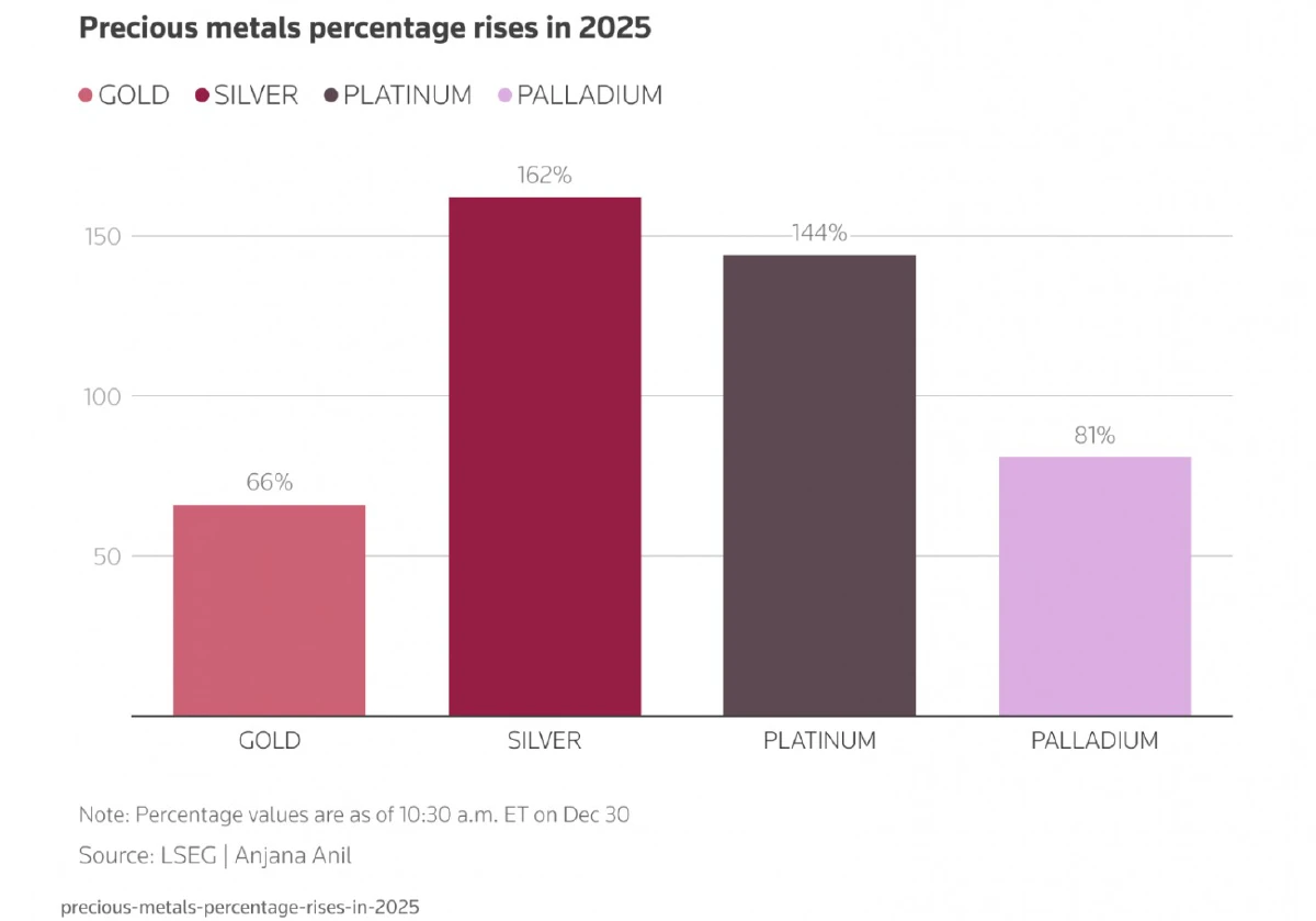 ทองคำ ซึ่งถูกมองว่าเป็นสินทรัพย์ปลอดภัย พุ่งขึ้น 66% ในปี 2025 ซึ่งเป็นการเพิ่มขึ้นที่สูงที่สุดนับตั้งแต่ปี 1979 โดยได้รับแรงหนุนจากปัจจัยหลายอย่างพร้อมกัน ได้แก่ การผ่อนคลายอัตราดอกเบี้ย ความขัดแย้งทางภูมิรัฐศาสตร์ การซื้อทองคำอย่างแข็งแกร่งของธนาคารกลาง และกระแสเงินทุนไหลเข้าสู่กองทุน ETF ที่มีทองคำเป็นสินทรัพย์ค้ำประกัน