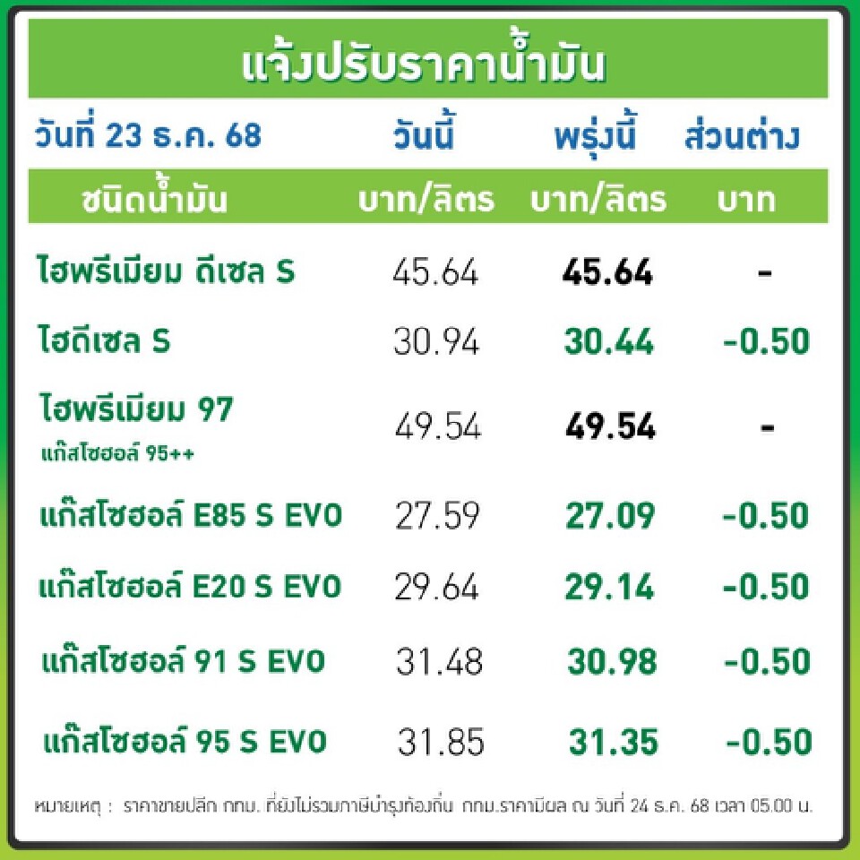 - การปรับราคาครั้งล่าสุดคือเมื่อวันที่ 24 ธ.ค. 68 โดยลดราคากลุ่มเบนซิน แก๊สโซฮอล์ และดีเซลลง 50 สตางค์ต่อลิตร
