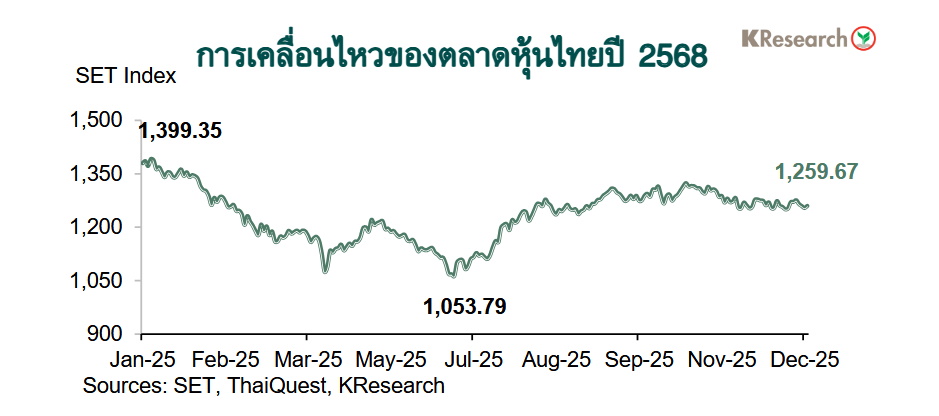 สำหรับภาพรวมระหว่างวันที่ 2 ม.ค.-30 ธ.ค. 2568 นั้น ดัชนี SET ปิดที่ระดับ 1,259.67 จุด (ณ 30 ธ.ค. 68) ลดลง 10.04% จากระดับ 1,400.21 จุด ณ สิ้นปี 2567