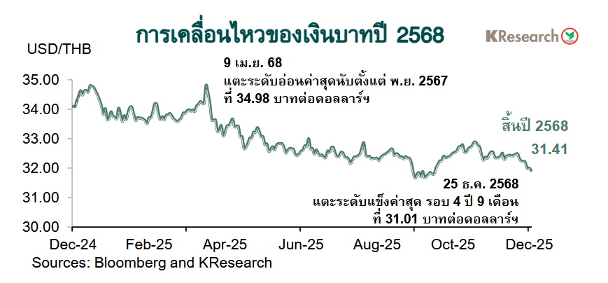 สำหรับภาพรวมในปี 2568 (2 ม.ค.-30 ธ.ค. 2568) เงินบาทแข็งค่าขึ้น 8.5% มาปิดตลาด ณ สิ้นปี 2568 ที่ 31.41 บาทต่อดอลลาร์ฯ จากระดับ 34.10 บาทต่อดอลลาร์ฯ ณ สิ้นปี 2567