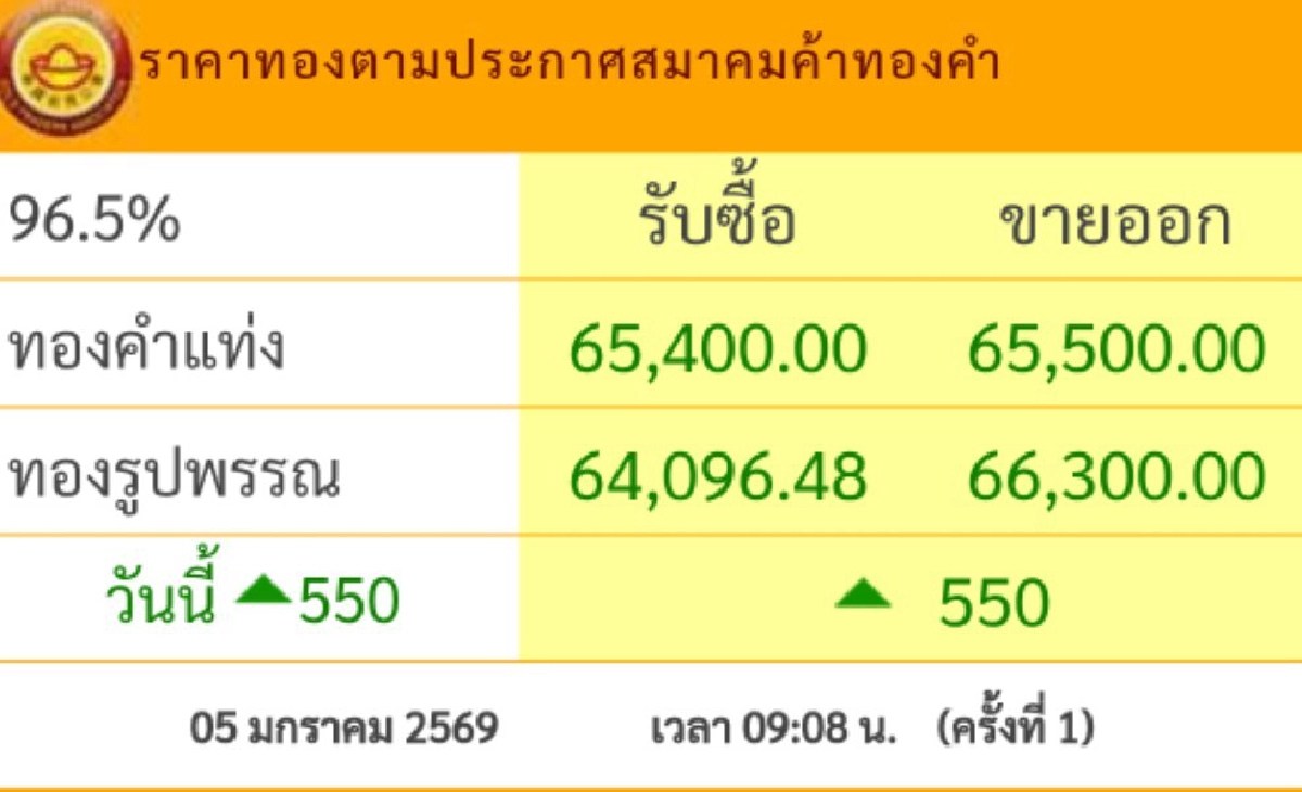 ราคาทองวันนี้ ประจำวันจันทร์ที่ 5 ม.ค. 69 สมาคมค้าทองคำ ประกาศ ราคาซื้อ - ขาย (ประกาศครั้งที่ 1 ) เมื่อเวลา 09.08 น.