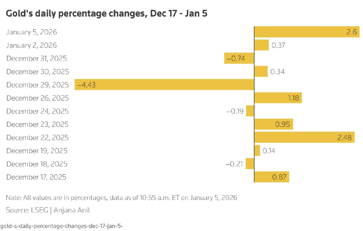 ราคาทองคำทะยานขึ้น 64% ในปีที่แล้ว โดยได้รับแรงหนุนจากสถานการณ์ความขัดแย้งทางการเมืองระหว่างประเทศและการผ่อนคลายอัตราดอกเบี้ยของธนาคารกลางสหรัฐฯ ความคาดหวังว่าอัตราดอกเบี้ยจะลดลงอีก ประกอบกับการซื้อทองคำโดยธนาคารกลางของหลายประเทศและการไหลเข้าของเงินทุนในกองทุนอีทีเอฟ ETF ก็ยิ่งหนุนราคาทองคำให้สูงขึ้นไปอีก สหรัฐฯ โจมตีเวเนซุเอลาและโค่นล้มประธานาธิบดีนิโคลัส มาดูโร เมื่อวันเสาร์ (3 ม.ค.69) ซึ่งเป็นการแทรกแซงโดยตรงรุนแรงสุดของวอชิงตันในลาตินอเมริกา นับตั้งแต่การรุกรานปานามาในปี 1989