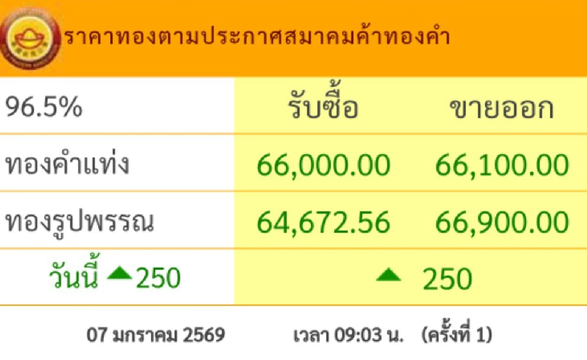 ราคาทองวันนี้วันพุธที่ 7 มกราคม 2569 ประกาศครั้งที่ 1 (เปิดตลาด) เมื่อเวลา 09.03 น. ปรับตัวเพิ่มขึ้น 250 บาท สู่บริเวณ 66,100 บาท เมื่อเทียบกับประกาศราคาซื้อขายครั้งสุดท้ายของเมื่อวาน(อังคาร) ที่ระหว่างวันมีการประกาศราคาทองคำทั้งหมด 12 ครั้ง รวมราคาปรับตัวเพิ่มขึ้น 150 บาท