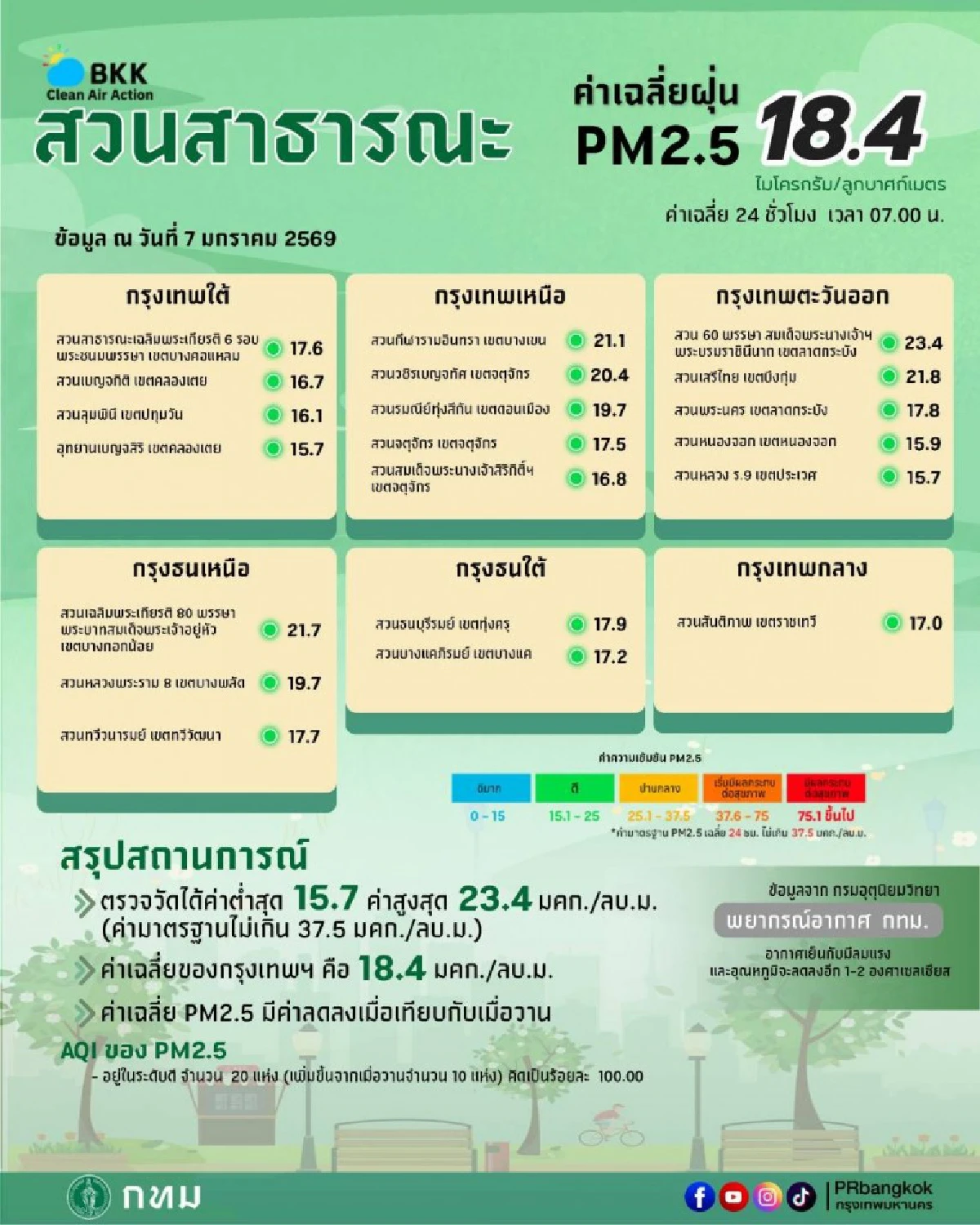 วันนี้ 7 มกราคม 2569 เวลา 07.00 น. ศูนย์ข้อมูลคุณภาพอากาศกรุงเทพมหานคร ขอรายงานสถานการณ์ฝุ่นละอองขนาดไม่เกิน 2.5 ไมครอน (PM 2.5) ในกรุงเทพมหานคร