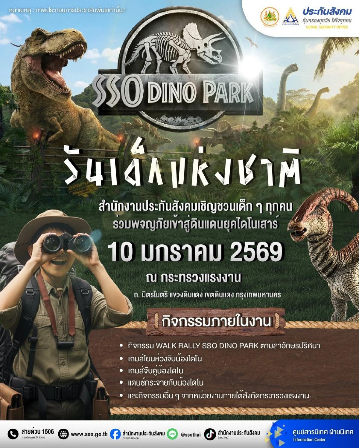 สำนักงานประกันสังคม จัดกิจกรรม วันเด็กแห่งชาติ ประจำปี 2569 ภายใต้ธีม “SSO DINO PARK” ชวนน้อง ๆ หนู ๆ ร่วมผจญภัยในดินแดนไดโนเสาร์ แปลงร่างเป็นนักสำรวจตัวจิ๋ว สนุกสนานไปกับกิจกรรมสร้างสรรค์หลากหลายรูปแบบ พร้อมลุ้นรับของรางวัลมากมายตลอดงาน
