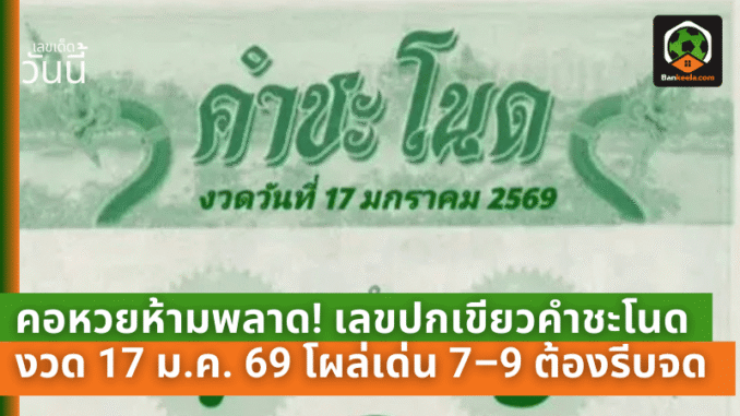 สำหรับงวดวันที่ 17 มกราคม 2569 เลขจาก “คำชะโนด (ปกเขียว)” ที่โผล่เด่นในชุดนี้ คือเลข 7 และ 9 ถูกดันขึ้นมาเป็นเลขนำขบวน คอหวยหลายคนเลยเริ่มโฟกัสไปที่เลขสองตัวนี้เป็นพิเศษ