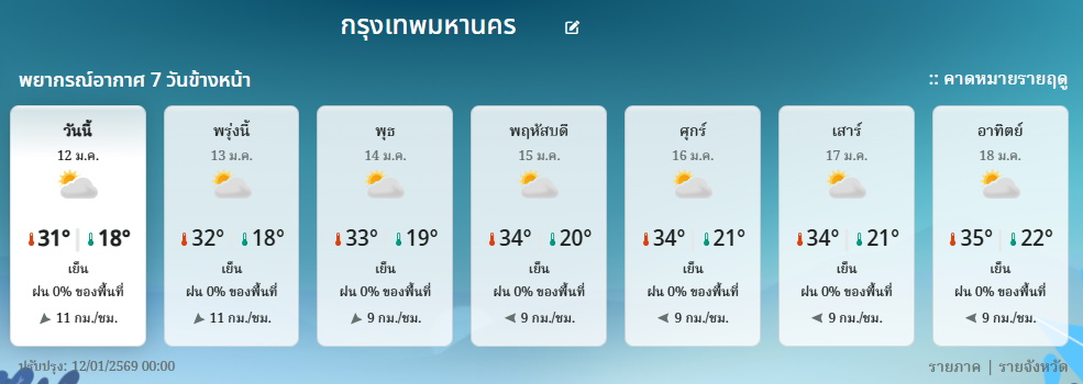 กรมอุตุนิยมวิทยา พยากรณ์อากาศ 24 ชั่วโมงข้างหน้า(12 ม.ค.69)ว่า ลักษณะอากาศทั่วไปประเทศไทยยังคงมีอากาศหนาวเย็น โดยภาคเหนือและภาคตะวันออกเฉียงเหนือมีอากาศหนาว ส่วนภาคกลาง ภาคตะวันออก และภาคใต้ตอนบนมีอากาศเย็นถึงหนาว เนื่องจากบริเวณความกดอากาศสูงหรือมวลอากาศเย็นกำลังค่อนข้างแรงปกคลุมประเทศไทยตอนบนและภาคใต้ตอนบน ขอให้ประชาชนดูแลรักษาสุขภาพเนื่องจากสภาพอากาศที่หนาวเย็น และระวังอันตรายจากอัคคีภัยเนื่องจากสภาพอากาศแห้ง