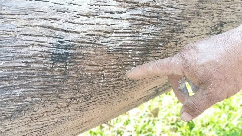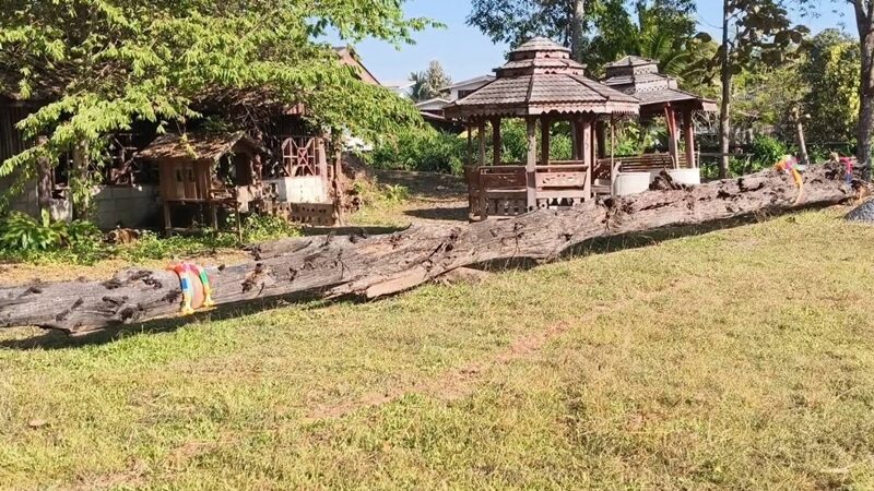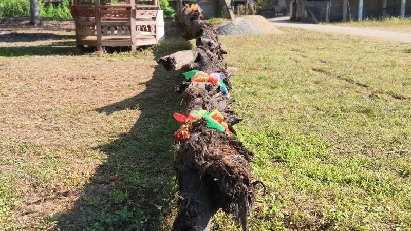 ต้นตะเคียนทองถูกนำขึ้นมาไว้บนฝั่งหลังจากขุดพบ