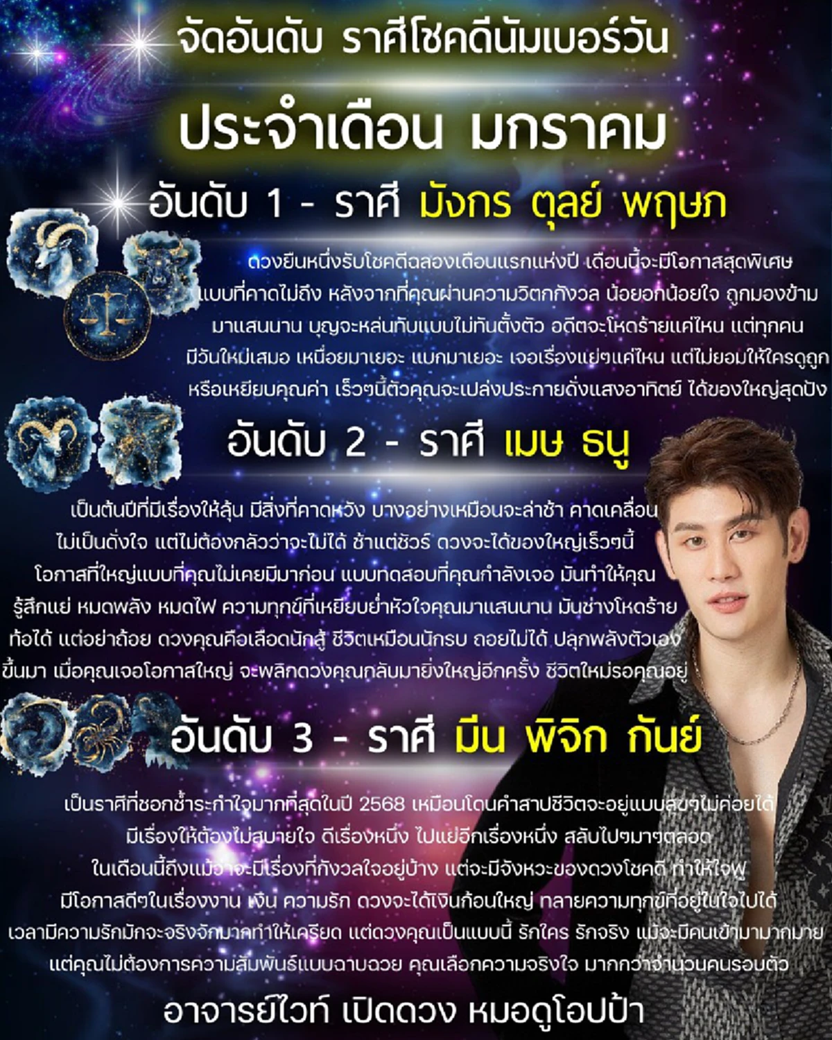 อาจารย์ไวท์ หมอดูโอปป้า จัดอันดับ ราศีโชคดีนัมเบอร์วัน ประจำเดือนมกราคม ราศีไหนดวงยืนหนึ่งรับโชคดีฉลองเดือนแรกแห่งปี บุญจะหล่นทับแบบไม่ทันตั้งตัว พลิกดวงคุณกลับมายิ่งใหญ่อีกครั้ง ดวงจะได้เงินก้อนใหญ่ ทลายความทุกข์ที่อยู่ในใจไปได้