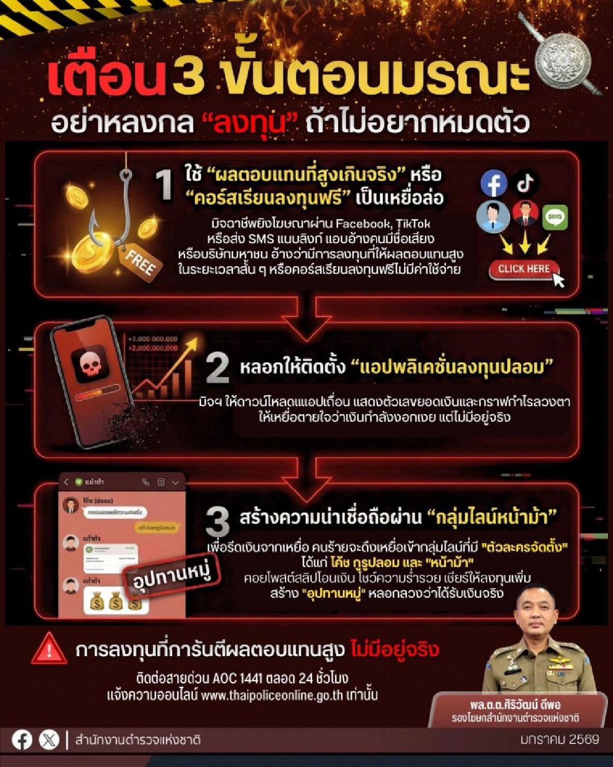 ตำรวจบอกหมด ชวนลงทุนออนไลน์ เปิดความจริง 3 ขั้นตอน ถ้าเชื่อโดนแน่หมดตัว ระวังเจอใน Facebook, TikTok