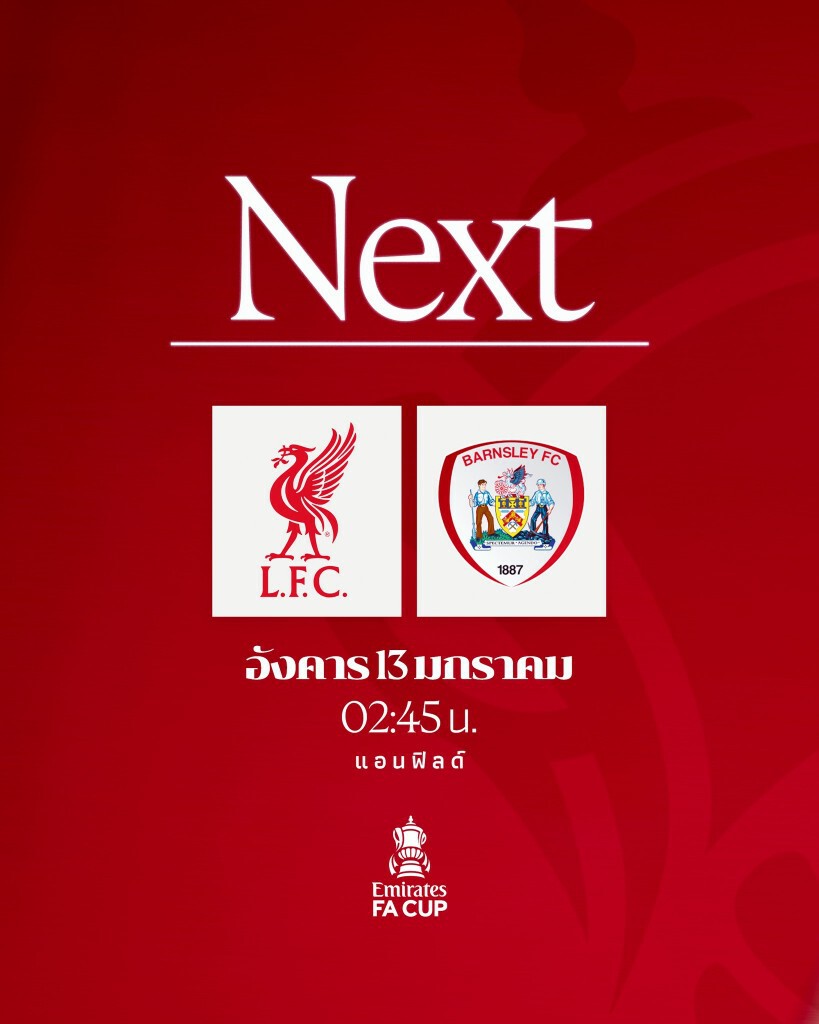 การแข่งขันฟุตบอลเอฟเอ คัพ The Emirates FA Cup 2025/26 รอบ 3 คู่ที่จะลงสนามในคืนมันเดย์ไนท์ จะเป็นการพบกันระหว่าง หงส์แดง ลิเวอร์พูล เปิดรังแอนฟิลด์รับการมาเยือนของ บาร์นสลีย์ ทีมจากลีกวัน แฟนบอลไทยสามารถติดตามชมฟุตบอลคู่นี้ ผ่านการถ่ายทอดสด ดูบอลสด ดูบอลออนไลน์กันได้ทาง Monomax และ AIS PLAY