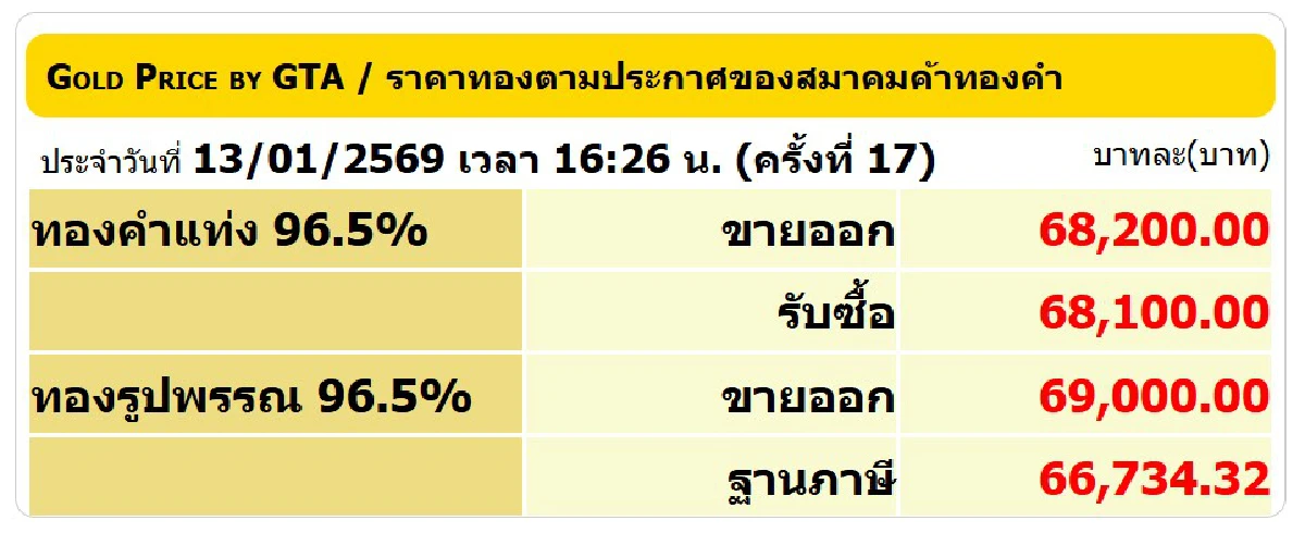 ที่มา : ราคาทองคำวันนี้ (13 ม.ค. 69) ปรับ 17 ครั้ง ล่าสุด ปิดตลาด บวก 500 บาท