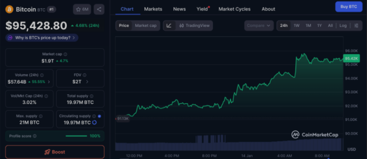 ในขณะที่รายงาน ราคา Bitcoin กำลังซื้อขายอยู่ที่ 95,428 ดอลลาร์ เพิ่มขึ้น 4.68% ภายใน 24 ชั่วโมง อ้างอิงข้อมูลจาก coinmarketcap