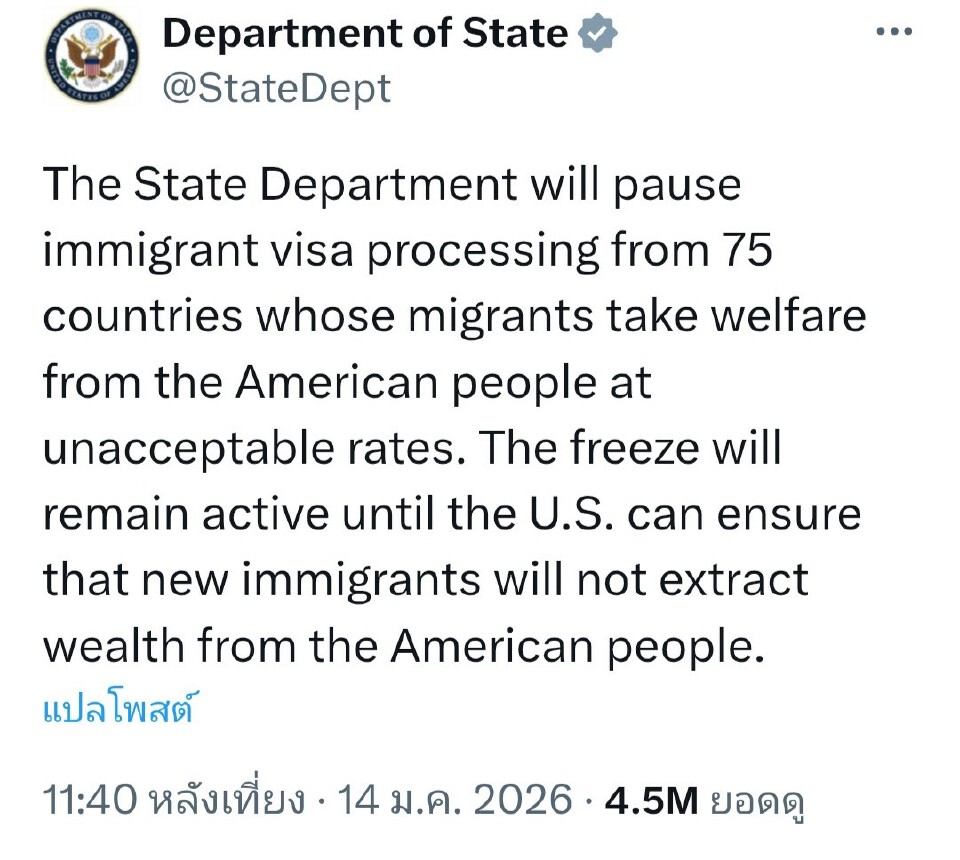 กระทรวงการต่างประเทศสหรัฐ ยืนยัน ระงับการออกวีซ่าผู้อพยพ 75 ประเทศรวมไทยเข้าประเทศ เริ่ม 21 ม.ค.นี้ เพื่อเพิ่มการคัดกรอง ไม่ให้เข้ามาเพื่อใช้ประโยชน์จากสวัสดิการของรัฐบาลสหรัฐฯ การขอวีซ่าท่องเที่ยว ธุรกิจยังไปต่อได้