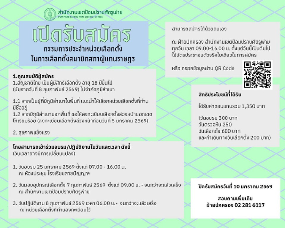 - วันเลือกตั้ง : วันที่ 1 หรือ 8 กุมภาพันธ์ 2569 / ณ สถานที่ในพื้นที่เขตเลือกตั้งนั้นๆ (ตามที่คณะกรรมการการเลือกตั้งประจำเขตเลือกตั้งกำหนด)