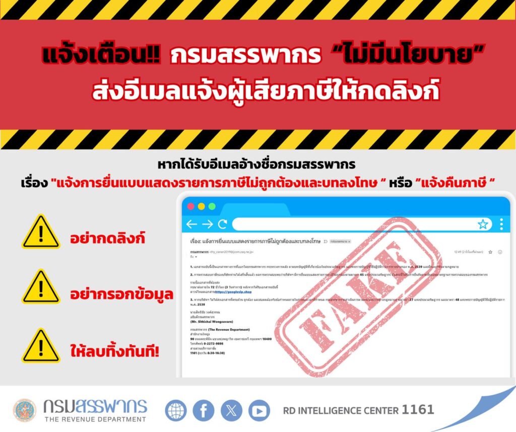 กรมสรรพากร ยืนยัน “ไม่มีนโยบาย” ส่งอีเมลให้กดลิงก์เพื่อขอรับเงินคืนภาษี หรือให้กรอกข้อมูลส่วนบุคคลใด ๆ ทั้งสิ้น