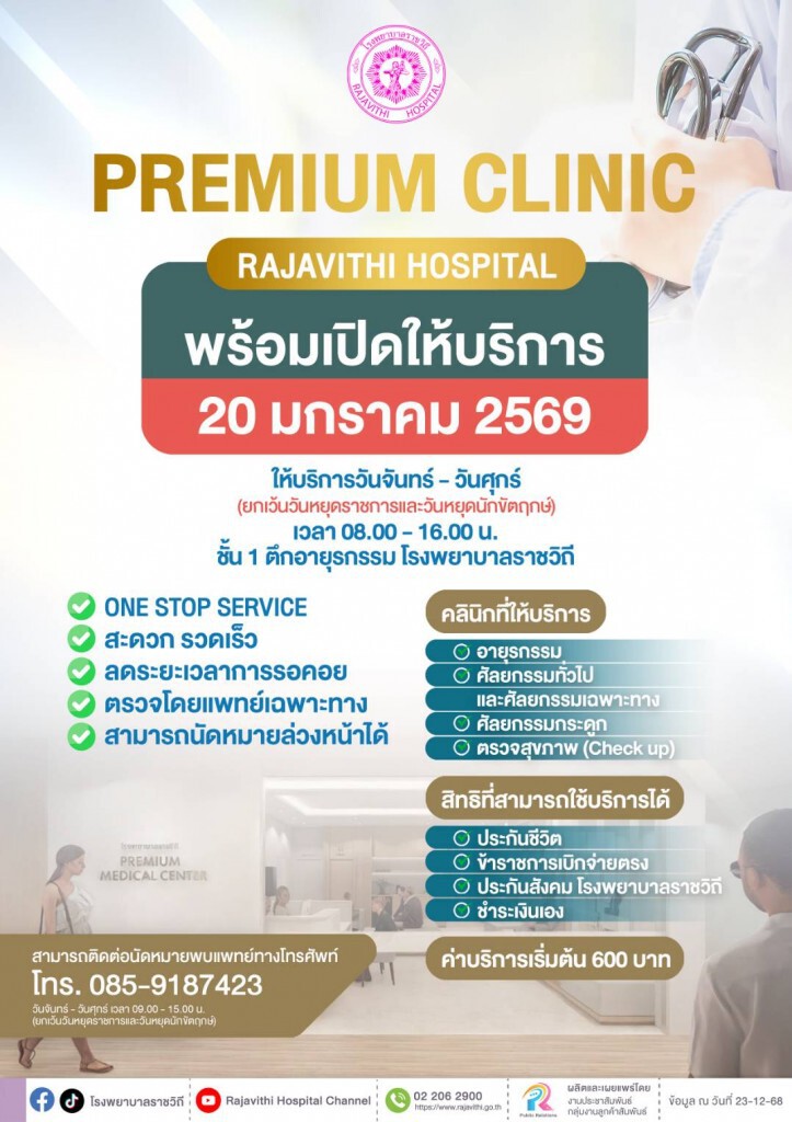 - โรงพยาบาลราชวิถีเปิดให้บริการ ‘Premium Clinic’ เพื่อเป็นทางเลือกในการเข้ารับบริการจากแพทย์เฉพาะทาง ลดความแออัดและระยะเวลารอคอย