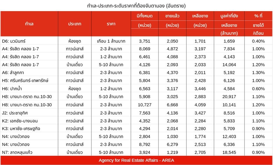- ศูนย์ข้อมูลวิจัยฯ เปิดเผย 15 ทำเลอสังหาริมทรัพย์ที่น่าเป็นห่วงสำหรับนักลงทุนและผู้ซื้อ เนื่องจากมีหน่วยที่อยู่อาศัยเหลือขายในตลาดจำนวนมาก