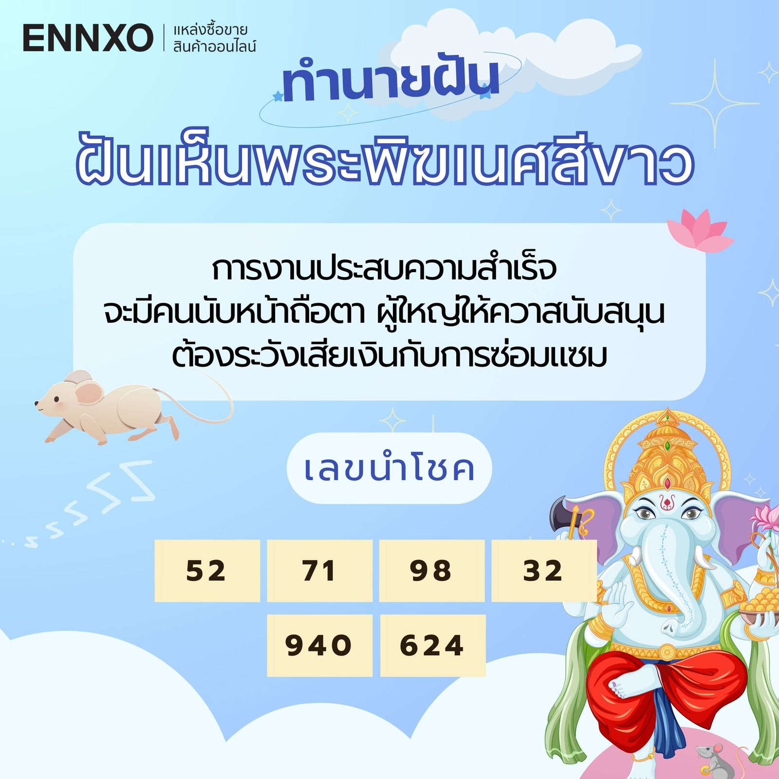 ฝันเห็นพระพิฆเนศองค์สีขาว ทำนายฝันว่าเป็นช่วงที่การงานประสบความสำเร็จ ผลงานสร้างชื่อเสียงให้คุณ จะมีคนนับหน้าถือตา ผู้ใหญ่ให้ความสนับสนุนช่วยเหลือ แต่ต้องระวังอาจจะต้องเสียเงินทองไปกับการซ่อมแซมของใช้ภายในบ้าน