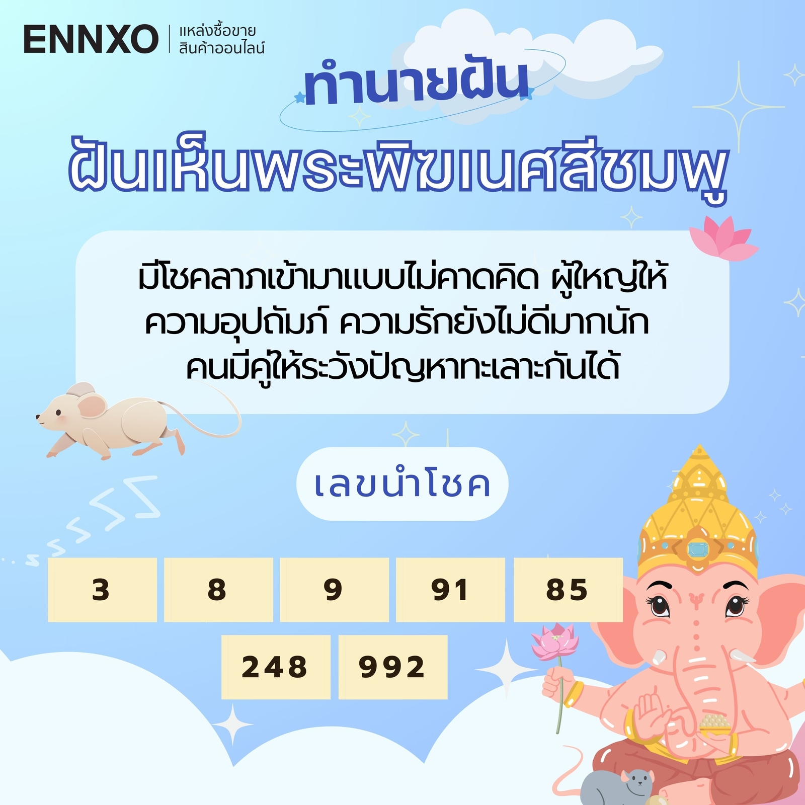 ฝันเห็นพระพิฆเนศสีชมพูองค์ใหญ่หรือองค์เล็ก ทำนายว่าจะมีโชคลาภเข้ามาแบบไม่คาดคิด มีผู้ให้ความช่วยเหลืออุปถัมภ์ ช่วงนี้ผลงานสร้างชื่อเสียงให้กับคุณ แต่เรื่องความรักอาจจะยังไม่ดีมากนัก คนโสดจะได้เจอคนที่ถูกใจแต่เข้ามาแล้วก็หายไป ส่วนคนมีคู่ให้ระวังปัญหาอาจเกิดการทะเลาะกันได้