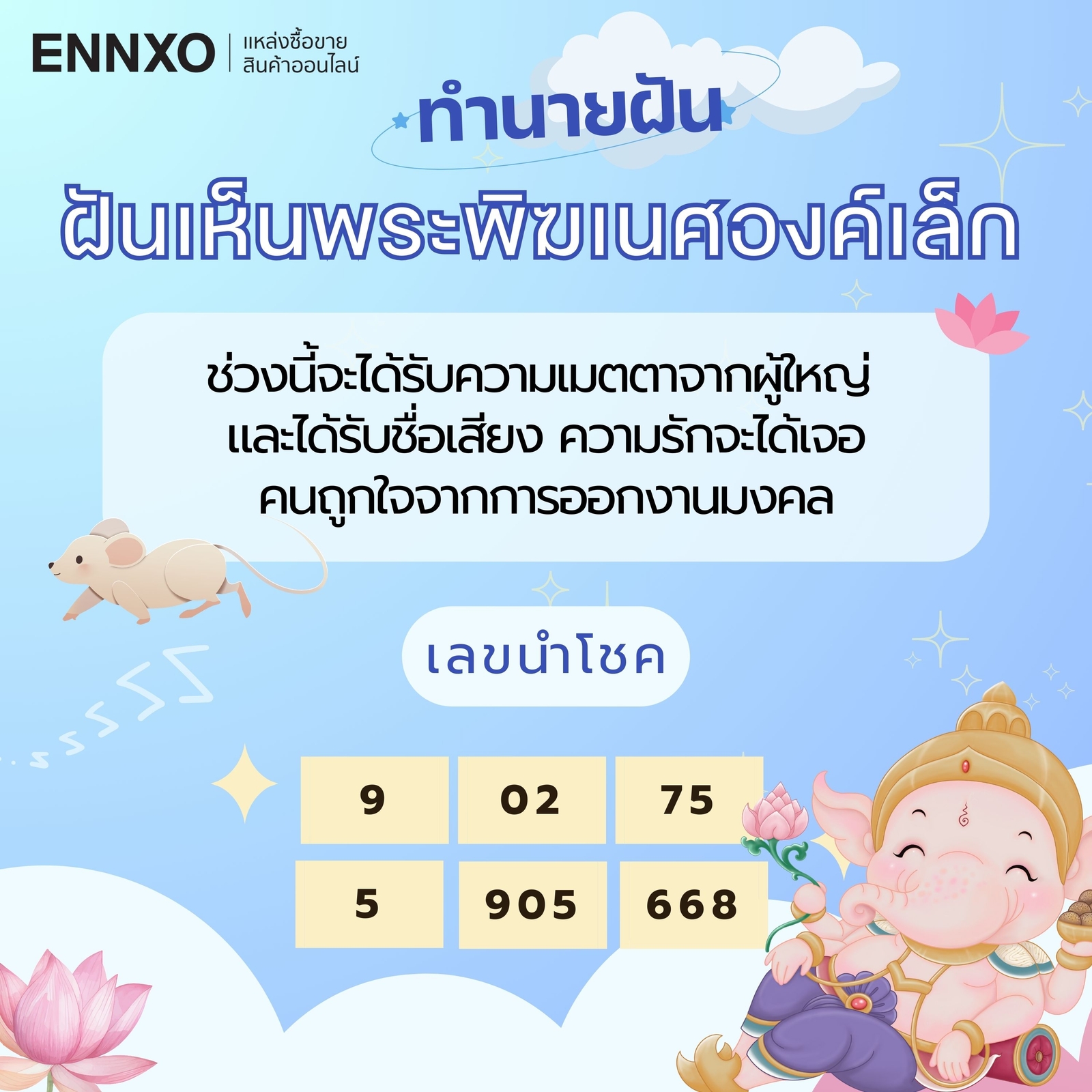ฝันเห็นพระพิฆเนศองค์เล็ก ทำนายฝันช่วงนี้จะได้รับความเมตตาเอ็นดูจากผู้หลักผู้ใหญ่ ทั้งยังได้รับการโปรโมทในตำแหน่งการงาน และจะได้รับชื่อเสียงจากผลงาน รวมถึงด้านความรักจะได้เจอคนถูกใจจากการไปงานมงคลจนสามารถพัฒนาความสัมพันธ์กันได้