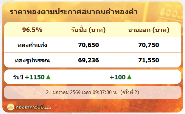 สมาคมค้าทองคำ ประกาศราคาทอง ประจำวันที่ 21 มกราคม 2569 เวลา 09.37 น. ปรับทั้งหมด +1,150 บาท