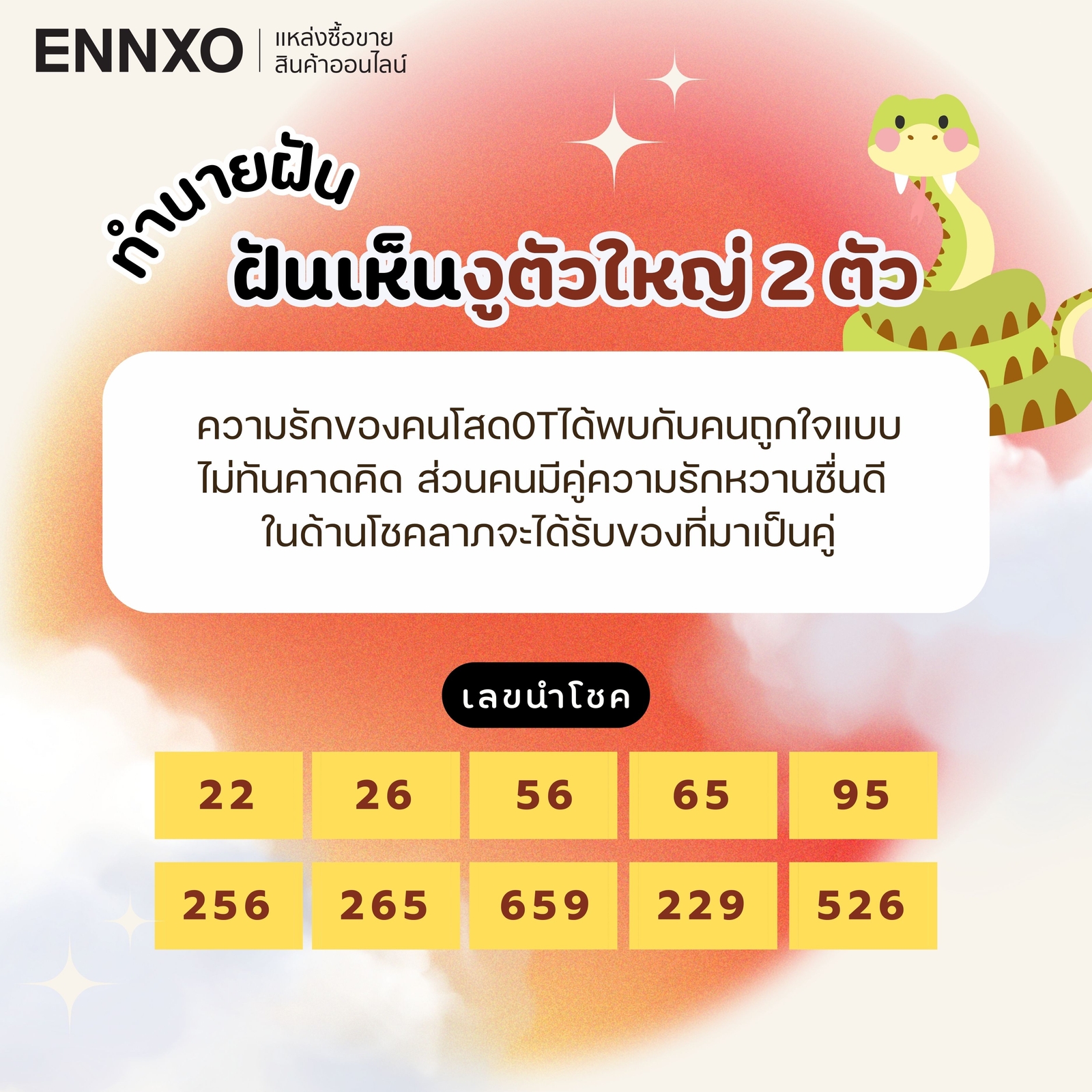 ฝันเห็นงูใหญ่ 2 ตัว ทำนายฝันแม่นๆ ทั้งในเรื่องความรักและด้านโชคลาภ ความรักของคนโสดช่วงนี้มีเกณฑ์ได้พบกับคนถูกใจแบบไม่ทันคาดคิด ส่วนคนมีคู่ความรักหวานชื่นดี ไม่มีปัญหาให้ต้องปวดหัว ในด้านโชคลาภจะได้รับของที่มาเป็นคู่ เช่นได้งานบวกได้เงิน หรือ ได้โชคบวกมีคนช่วยเหลือ ใครที่คิดเรื่องทำธุรกิจช่วงนี้เป็นช่วงที่ดีมาก