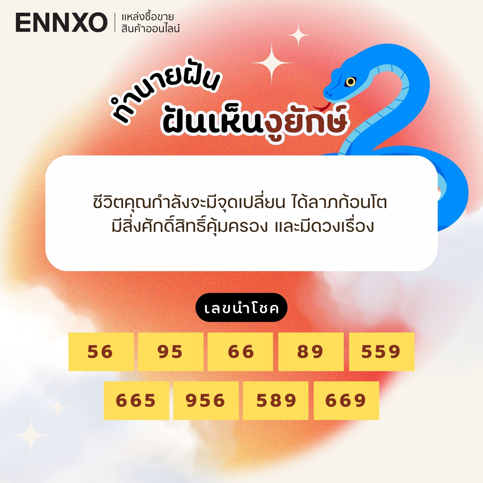 - การเงิน/โชคลาภ การฝันเห็นงูนั้นเป็นสัญลักษณ์ของสัตว์นำโชค แน่นอนว่าด้านโชคลาภเงินทองนั้นโดดเด่นเป็นพิเศษ ใครอยากลองเสี่ยงโชคเป็นช่วงที่มีโอกาสถูกรางวัลสูงมาก