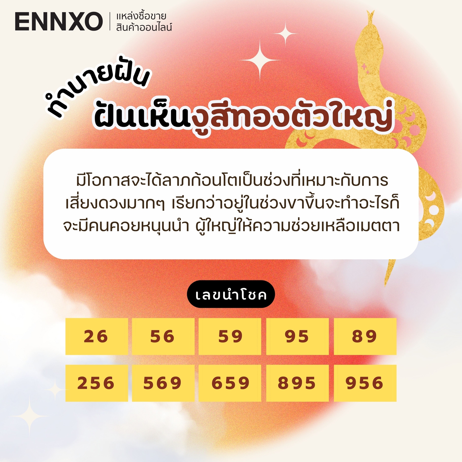 - เลขเด็ดฝันว่าเห็นงูสีทองตัวใหญ่ สามตัว: 256, 569, 659, 895, 956
