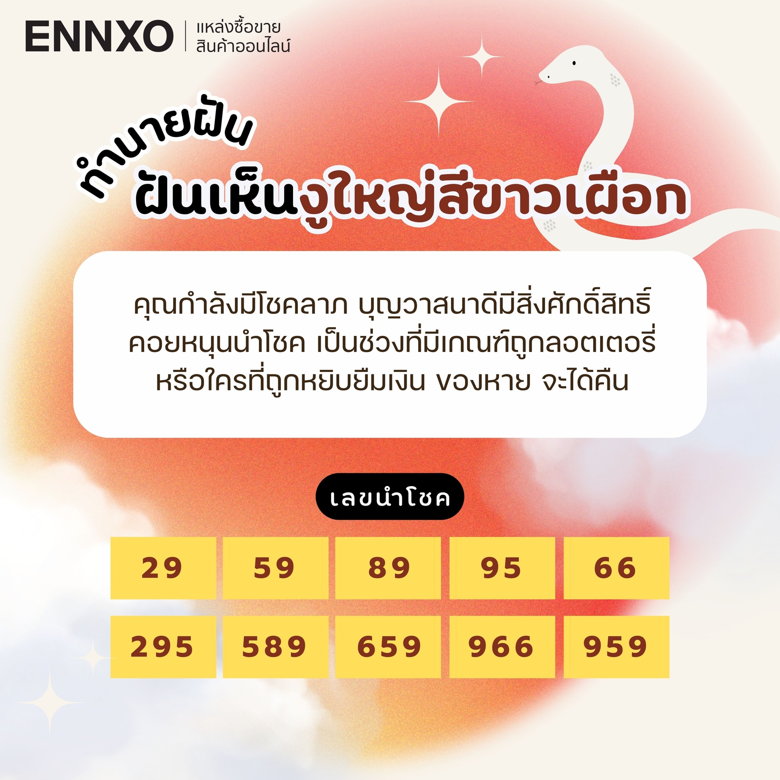 - เลขเด็ดฝันว่าเห็นงูสีขาวเผือกตัวใหญ่ สามตัว: 295, 589, 659, 966, 959