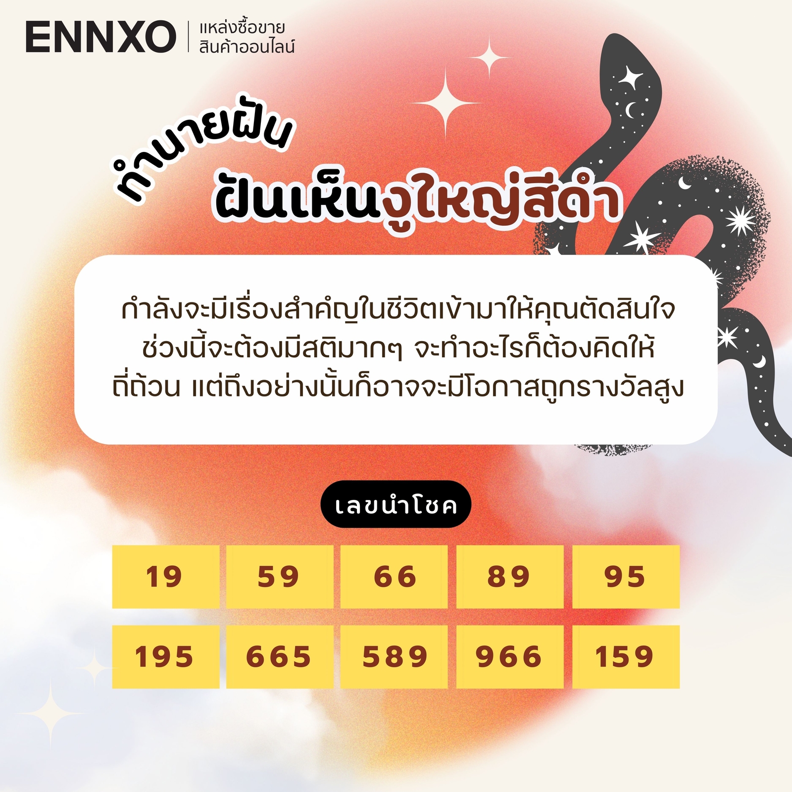 - เลขเด็ดฝันว่าเห็นงูใหญ่สีดํา สามตัว: 195, 665, 589, 966, 159