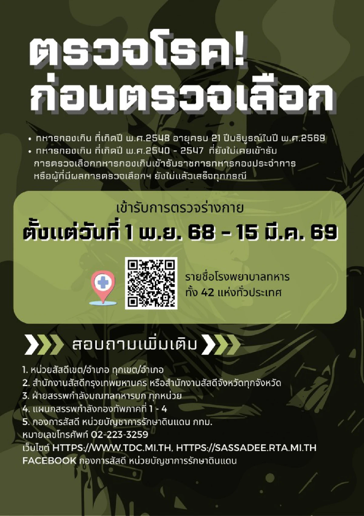 “ทหารเกณฑ์ 2569” กองการสัสดี เปิดรับการตรวจร่างกายและสภาพจิตใจ สำหรับทหารกองเกินที่ต้องเข้ารับการตรวจเลือกฯ ประจำปี 2569 เพื่อเตรียมความพร้อมและใช้ประกอบการพิจารณาในวันตรวจเลือกจริง ตั้งแต่บัดนี้ – 15 มีนาคม 2569