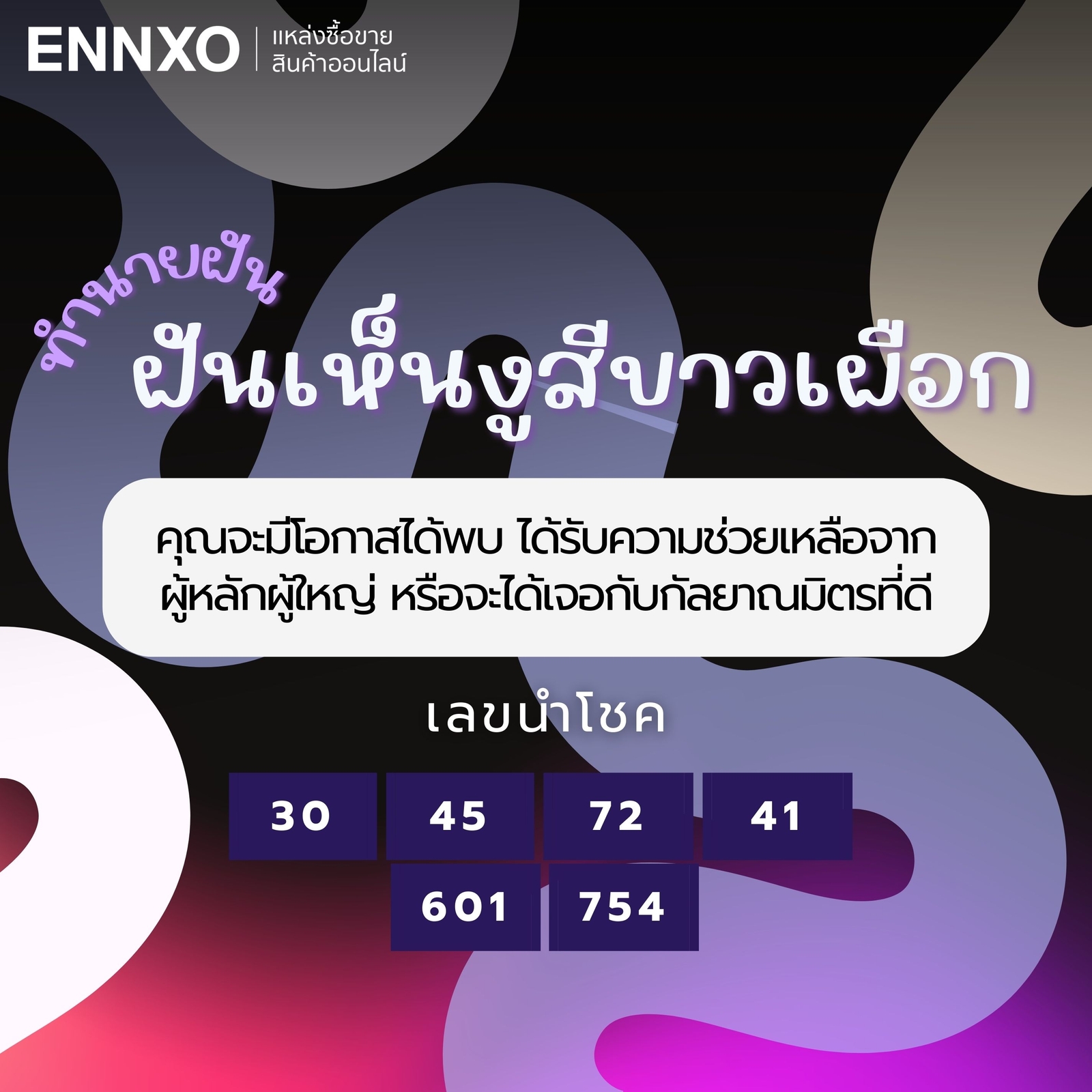 เลขเด็ดนำโชคฝันเห็นงูสีขาวเผือก: 30, 45, 72, 41