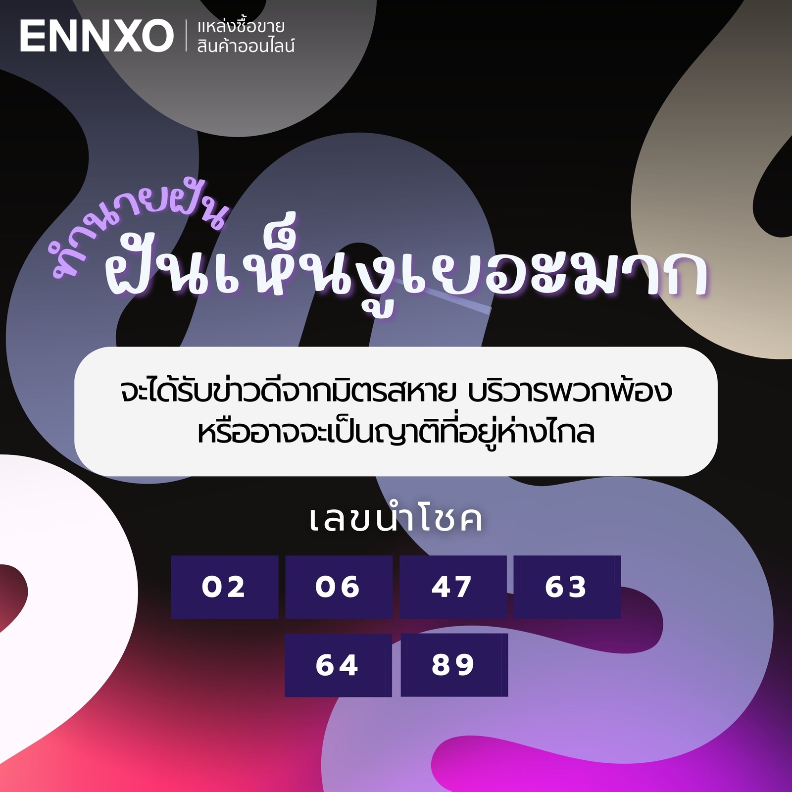 เลขเด็ดนำโชคฝันเห็นงูเยอะมากหลายตัว: 02, 06, 47, 63, 64, 89