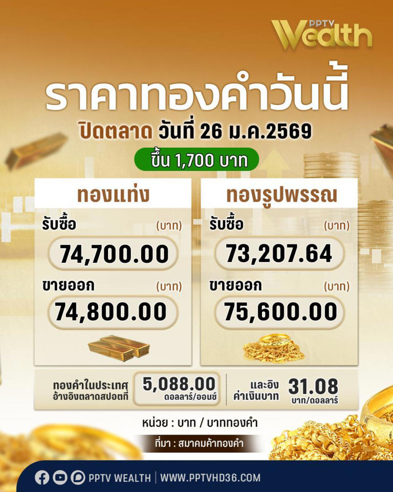 ที่มา : สมาคมค้าทองคำ ประกาศราคา วันที่ 26 ม.ค. 69 ปิดตลาดราคาเพิ่มขึ้น 1,700 บาท