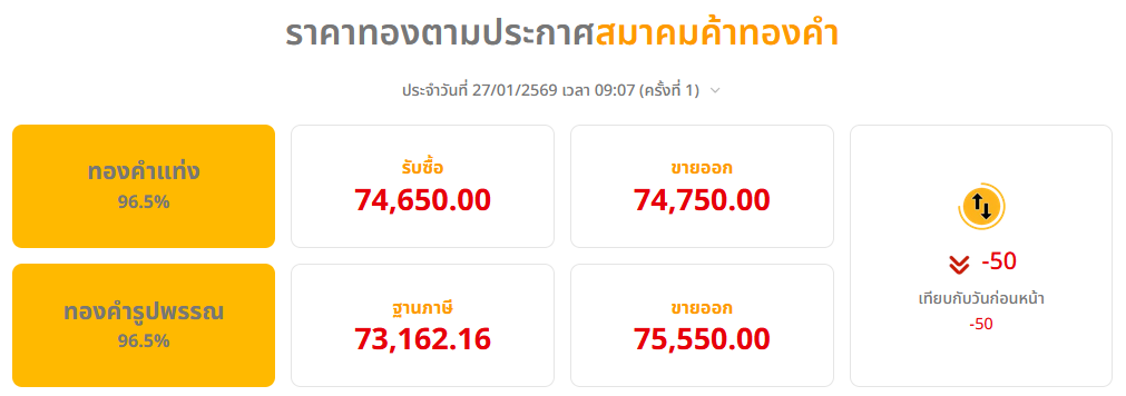 ที่มา : ราคาทองวันนี้ (27 ม.ค. 69) ปรับลง 50 บาท รูปพรรณบาทละ 75,550 บาท