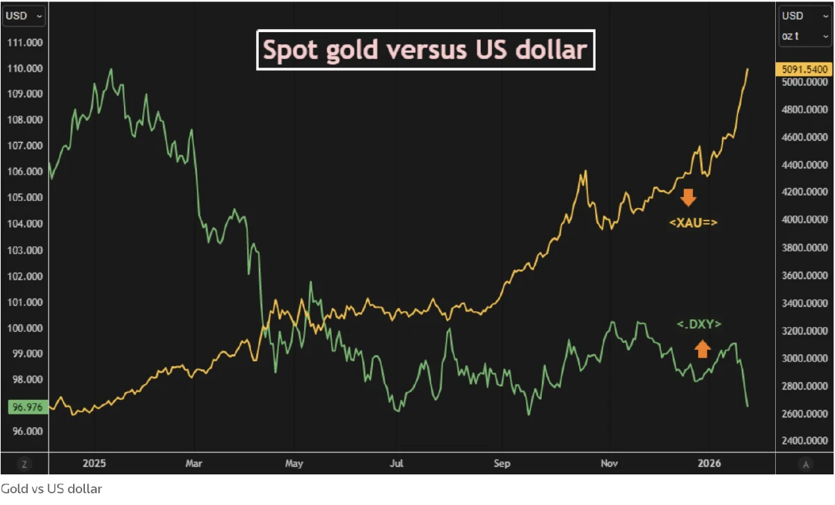 ราคาทองคำปรับตัวสูงขึ้น โดยทรงตัวเหนือ 5,000 ดอลลาร์ต่อออนซ์ เป็นวันที่สองติดต่อกัน เนื่องจากดอลลาร์ที่อ่อนค่าช่วยหนุนการปรับตัวขึ้นที่ได้รับแรงหนุนจากความเสี่ยงทางภูมิรัฐศาสตร์และการที่นักลงทุนเทขายพันธบัตร และสกุลเงินของรัฐบาล