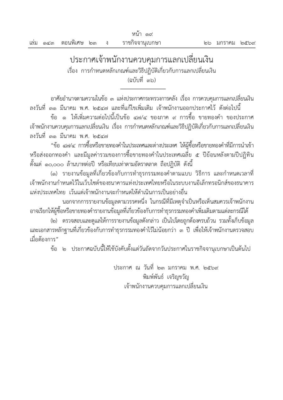 ราชกิจจาฯ ให้อำนาจธปท.คุมร้าน กำหนดผู้ซื้อขายทองคำในประเทศมูลค่าตั้งแต่ 1 หมื่นล้านบาทต่อปีในช่วง 5 ปีย้อนหลัง รายงานการทำธุรกรรมบนเว็บไซต์ธปท. – เก็บรวบรวมข้อมูลอย่างน้อยไม่เกิน 3 ปี เพื่อพนักงานต้องการตรวจสอบ มีผลบังคับใช้ 24 ม.ค.69